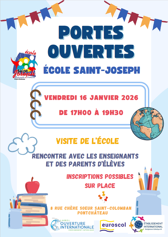 Venez découvrir l’école Saint-Joseph lors de ses portes ouvertes le vendredi 16 janvier 2026, de 17h à 19h30 !