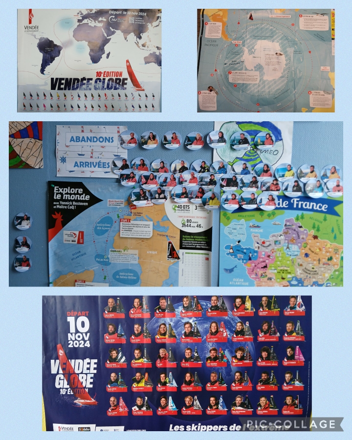 Cette année la classe des ce1B a suivi le Vendée Globe qui avait débuté le samedi 10 novembre 2024. Grâce à ce projet, les élèves ont voyagé régulièrement en suivant le parcours des skippers pour faire le tour du monde par le pôle sud en suivant le trajet sur une carte et des petites vidéos postées par les skippers pour apprendre comment ils vivent à bord, partager leurs moments de joie (visite d’un petit oiseau baptisé Albert par Jean Lecam, et le passage de dauphins filmé par Antoine Cornic…) ou de courage avec les avaries ou les passages plus agités en mer (pot au noir, les mers du Sud). Régulièrement, on mettait à jour le classement des skippers (top 6) et le nombre de jours passé en mer. Au fur et mesure de la course, on a marqué les abandons et les arrivées. On a suivi Yannick Bestaven (bateau Maitre Coq) qui malheureusement a dû abandonner sa course pour réparer son bateau dans un port. Malgré son abandon, on a continué à le suivre car il a repris la course en solitaire pour terminer son Vendée globe. On a suivi quelques arrivées et le 4 février, on a vu celle De Giancarlo Pedote en direct du port des Sables d’Olonne.