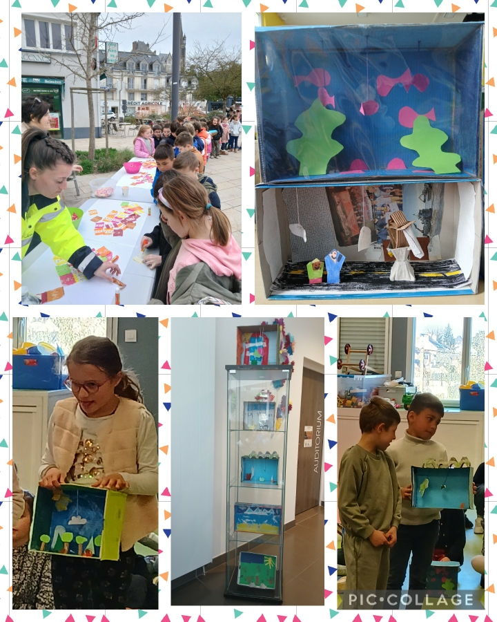 Les élèves de ce1B se sont initiés à la création d’œuvres collectives à partir de matériaux de recyclage rapportés de la maison. L’idée était de confectionner une boite à image à partir d’un couvercle ou boite à chaussures pour créer un paysage de : montagne, mer, océan, forêt, savane, ville, aquarium, printemps et danseuse.