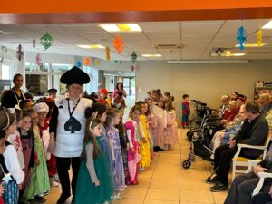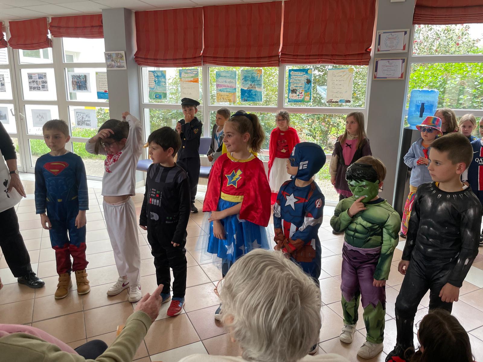 - Nous sommes allés défiler le matin devant les résidents de la maison de retraite de La Châtaigneraie et l’après-midi devant les résidents du Prieuré (dans tous les étages). Nous avons chanté et dansé pour eux. Ils nous ont même offert un goûter.