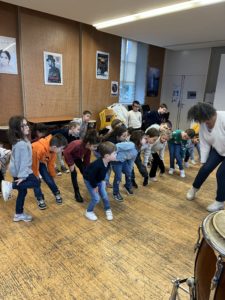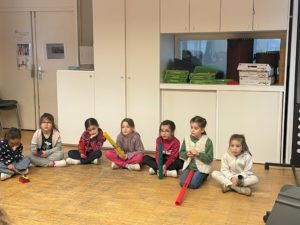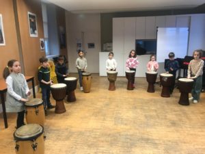 Chaque séance commençait par l’échauffement de notre corps sur une musique. Puis, ils reproduisaient des rythmes sur les instruments que Catherine leur mettait à disposition. Ils ont pu ainsi testé les tam-tam, les triangles , les tambourins, les maracas…