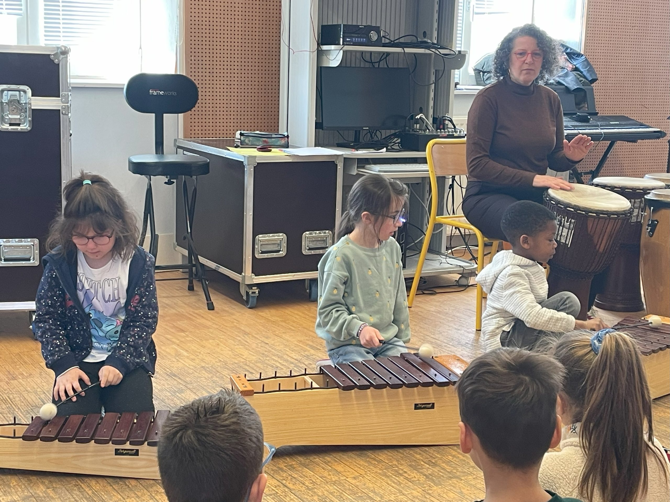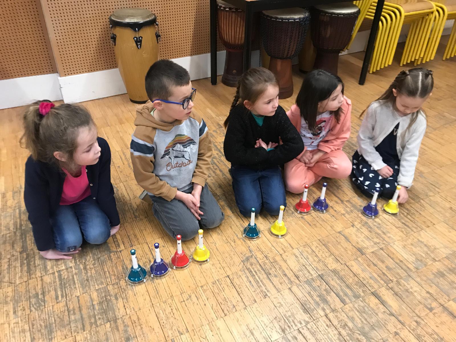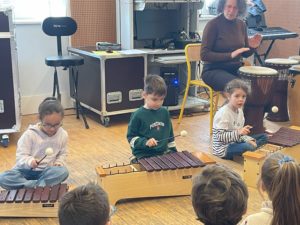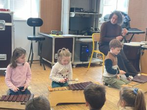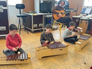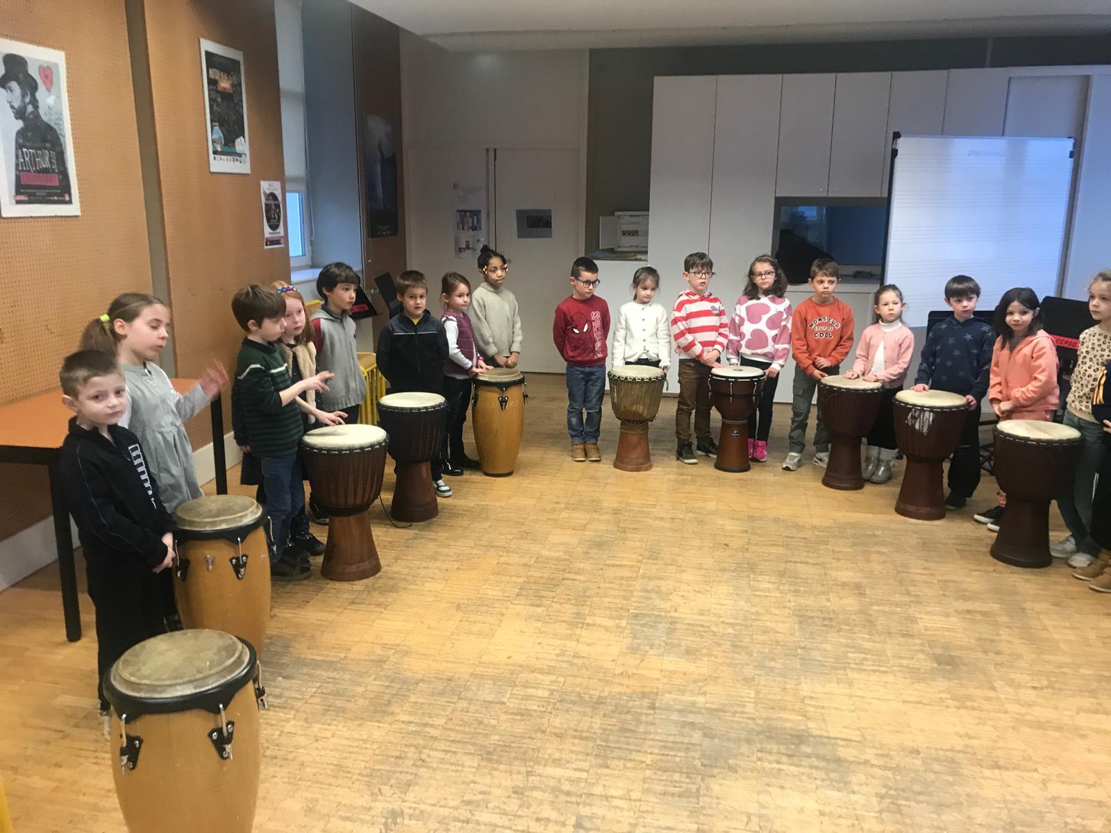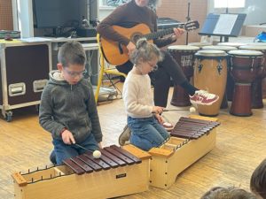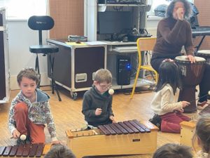 Durant 10 séances, les GS/CP, CPB, CP/CE1C se sont rendus à l’école de musique pour tester les percussions à travers leur corps et par l’utilisation de nombreux instruments.