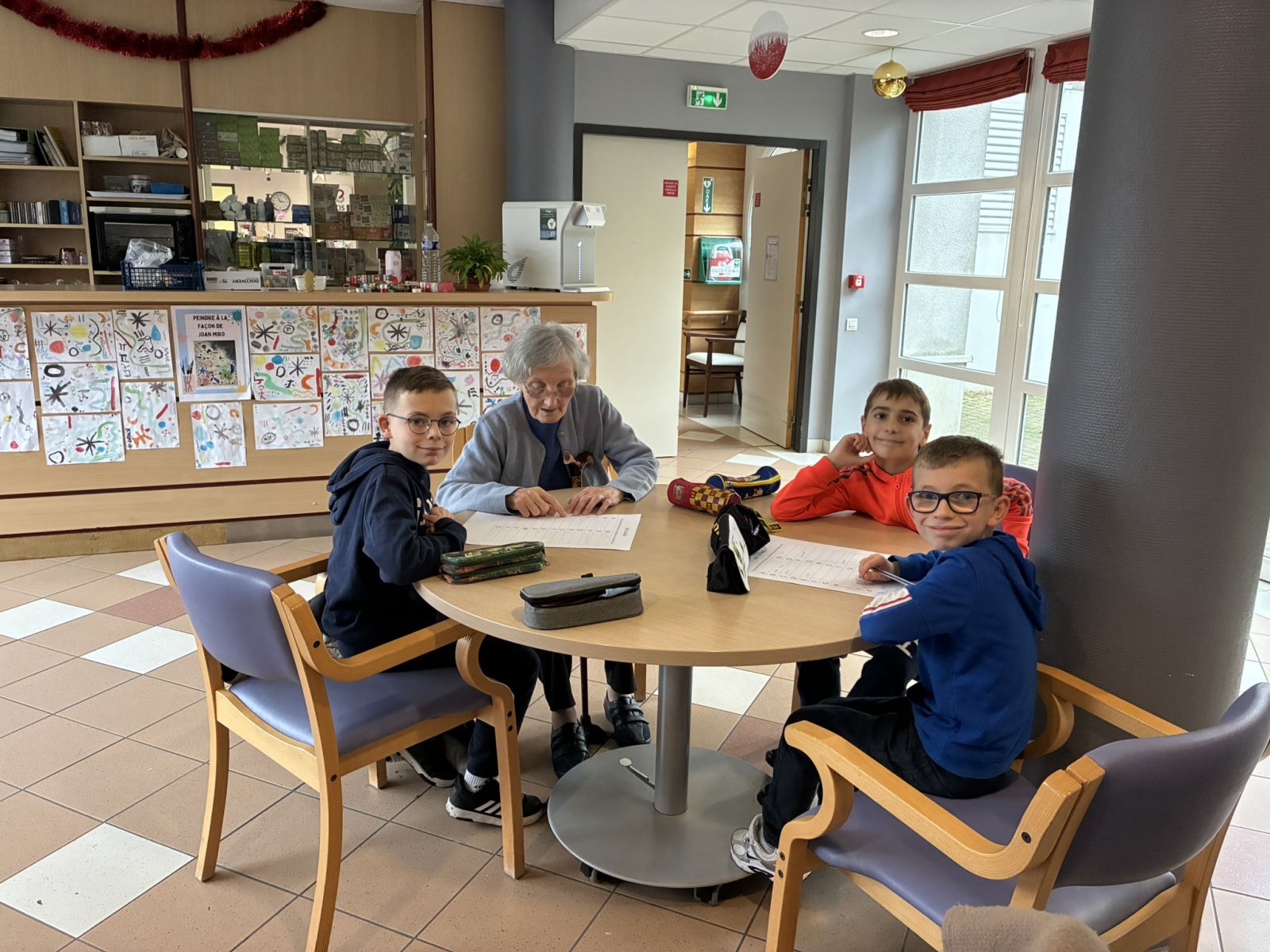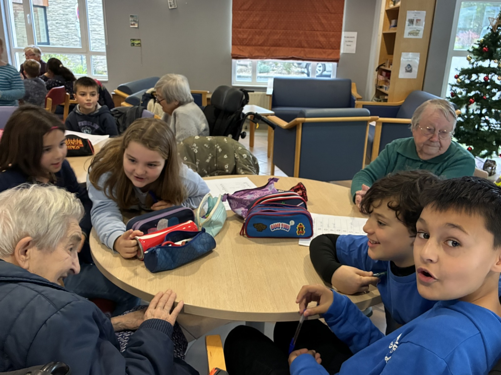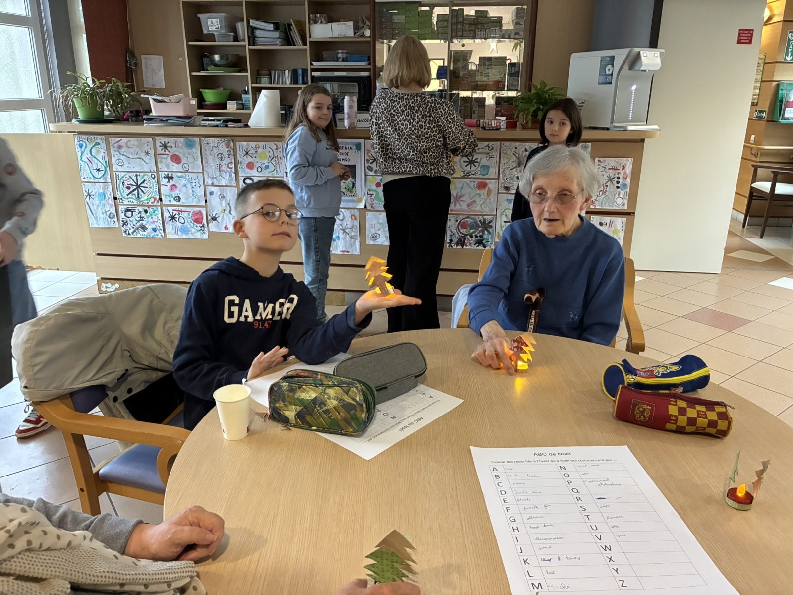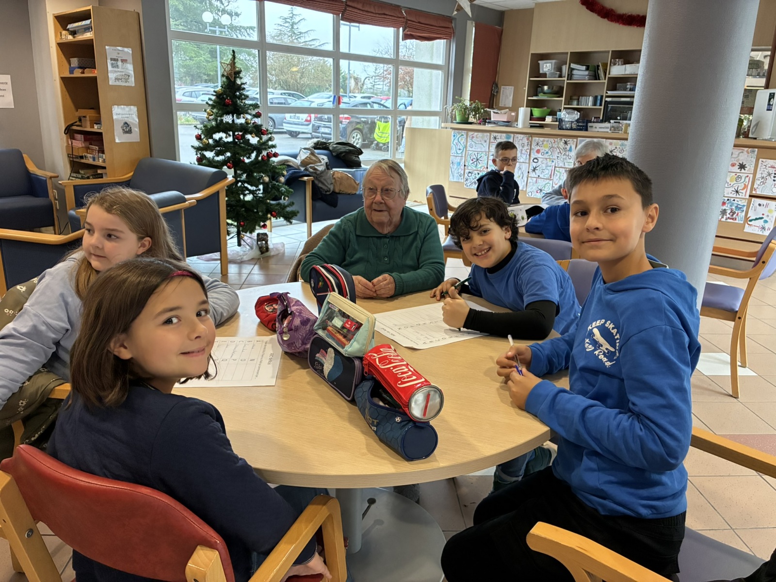 Comme à chaque période, c’est avec grand plaisir que les CM1B ont rendu visite aux résidents du Prieuré dans le cadre du projet intergénérationnel. Le thème de Noël était au programme. Résidents et élèves de CM1b étaient répartis en petits groupes pour chercher des mots à partir d’un abécédaire sur le thème de Noël et de l’hiver. Ce fut l’occasion pour les personnes âgées de partager leurs souvenirs de Noël lorsqu’ils étaient enfants. Chacun a ensuite confectionné un photophore pour décorer la maison.